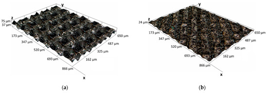 3D optical images of the surface topography for the experimental conditions (a) 18, i.e., = 1000 mm/s, = 150 µm, = 40, = ±90°, which allows the hydrophobic behaviour to take place; (b) 19, i.e., = 400 mm/s, = 50 µm, = 8, = ±90°/±45°, showing the surface topography that leads to the hydrophilic state.