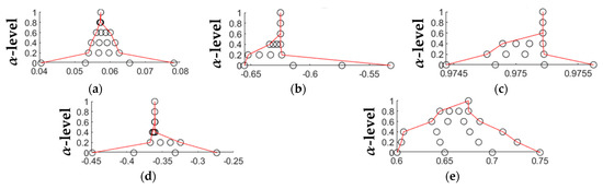 Nonlinear fuzzy numbers (a) , (b) , (c) , (d) , (e) , obtained starting from Equation (3) and optimized through the genetic algorithm presented in Section 2.2. The x-axes represent the support of the fuzzy numbers optimized at each α-level by taking into account a varying number of experimental data points according to the membership level, i.e., 100% at = 0, 80% at = 0.2, 60% at = 0.4; 40% at = 0.6, 20% at = 0.8, and 0% at = 1.