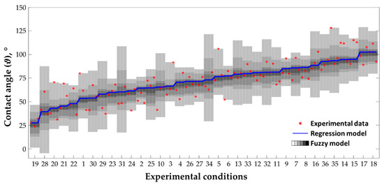 Fuzzy process map for the contact angle. The gray shaded area represents the membership function, which varies from white at = 0 while considering 100% of the experimental data points, to black at = 1 when the fuzzy number coincides with the empirical coefficients evaluated through standard linear regression. Each fuzzy band contains three data points (red asterisks) to which correspond a specific experimental condition, for a total of 36. The experimental tests are ordered for increasing values of the contact angle. For the experimental condition please refer to the parameters’ combinations reported in Table 5.