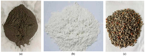 Secondary fly ash was produced by Gongyi Bolun Refractory Co., Ltd (Gongyi, China). The characteristic parameters are listed in Table 1. Lime was produced by the Maoshun Lime Factory, Jioxian County, Dongping County, Tai’an. Its characteristic parameters are listed in Table 2. The construction waste aggregate used in this test was mainly composed of concrete blocks, bricks, and stones, with particle sizes between 2 and 5 mm. Samples of these materials are shown in Figure 1.