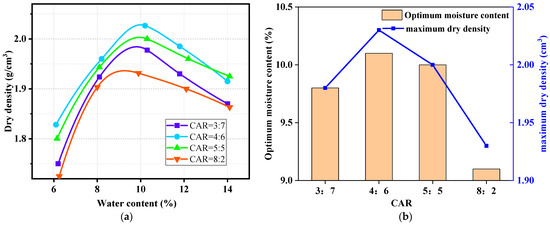 - Under different CAR conditions, the dry density first increased and then decreased with an increase in the water content. When CAR was 4:6, the optimum water content and maximum dry density reached the maximum values simultaneously, which were 10.1% and 2.03 g/cm3, respectively;