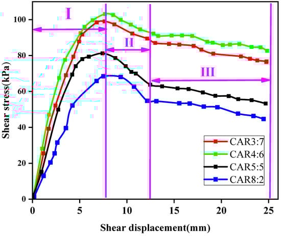 It can be seen from Figure 7 that under the condition of a fixed normal stress of 100 kPa, when the CARs were 3:7, 4:6, 5:5, and 8:2, the maximum shear strengths of the mixtures were 99.02, 103.13, 81.21, and 68.45 kPa, respectively. With the increase in shear displacement, the variation tendency of shear stress increased rapidly at first, then decreased slowly, and finally tended to be stable (or with a small variation). Therefore, the shear stress-displacement curve can be divided into three stages. The first stage is the energy storage stage, in which the shear stress-displacement changes approximately linearly. The gap of the mixture gradually becomes compact due to compression, and the mixture has not been damaged; therefore, the shear displacement is small, and the shear stress increases rapidly. The second stage is the failure stage. After the shear strengthening of the mixture, shear failure occurs. Owing to the large roughness of the contact surface formed by the initial failure, the shear stress decreases slowly during the process of relative displacement. The third stage is the stable friction stage. When the upper and lower failure surfaces run in to each other and reach a stable state, the friction coefficient is relatively fixed, the shear stress gradually tends to be stable, and the curve shows a relatively stable or slightly changing tendency. Construction waste aggregates had a positive effect in the shear resistance process, which prevented shear damage to the contact surface. After damage, the contact friction can be increased, and the shear strength of the material can be improved.