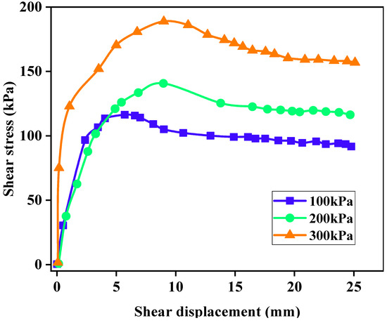 According to Figure 8, when the CAR of the mixture was 4:6, the maximum shear strength of the mixture when the normal stresses were 100, 200, and 300 kPa were 116.29, 140.27, and 188.80 kPa, respectively. The shear strength of the mixture increased with an increase in normal stress. This is because when the normal stress increases, the LFA particles and construction waste aggregate particles squeeze each other, which increases the cohesion force and thus increases the shear strength. When the shear strength reaches the maximum and enters the stable friction stage, the normal stress increases the contact pressure of the upper and lower failure surfaces, such that the shear stress also increases with an increase in the normal stress.