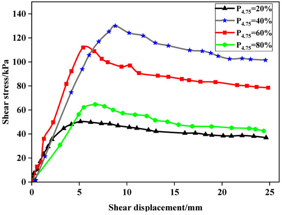 The influence of particle size on the shear strength of LFCWM was studied under a shear stress of 100 kPa. As shown in Figure 9, with the increase in shear displacement, the variation tendency of shear stress increased rapidly at first, then decreased slowly, and finally tended to be stable. With an increase in the amount of coarse aggregate, the shear strength of the mixture increased and then decreased. When P4.75 was 20%, 40%, 60%, and 80%, the corresponding maximum shear strengths of the mixed material were 50.29, 129.97, 111.93, and 64.58 kPa, respectively. It can be seen that when P4.75 was 40%, the shear strength of LFCWM was the largest. This is because the gradation of LFCWM changes owing to the change in the particle size of the recycled aggregate. When the aggregate particle size is small, the gradation effect is weak; thus, the strength of the aggregate itself has not a full effect. When the aggregate size is too large, the mosaic effect changes to a contact effect, and the contact structure forms a weak surface, which reduces the shear strength.