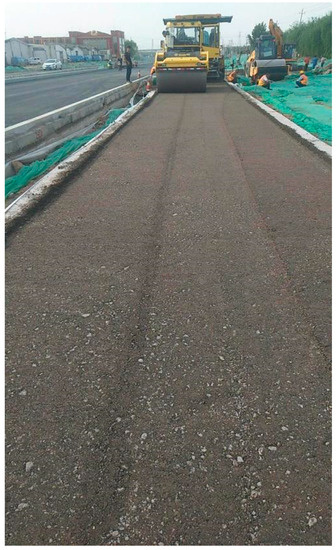 Because the mixture contains construction waste filling aggregate, the traditional construction technology may lead to insufficient rolling strength and high moisture content of construction waste aggregate, resulting in roadbed instability, service life reduction, and other problems. Therefore, construction should be avoided during the rainy season. If the construction is performed during the rainy season, the roadbed should be well protected against drainage. In the spreading process, the size of the grid was 8 m × 8 m, the virtual spreading coefficient was controlled at 1.18, the virtual spreading thickness was 350 mm, and the rolling method was vibration rolling.