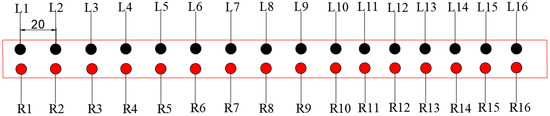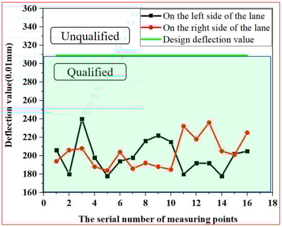 A section of 300 m was selected for sampling, and the sampling was divided into two rows of points on the left and right. The points on the left were L1–L16, and the points on the right were R1–R16, with a total of 32 monitoring points, as shown in Figure 11. The deflection values of the test points are presented in Figure 12. The detection results were between 1.8 and 2.4 mm, all lower than the design value of 3.09 mm. Therefore, the design requirements were met.