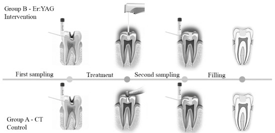 In this study, two oral samples were collected, one before and the other one after the treatments for patients of both CT and Er:YAG therapy groups. The specimen was taken using a small sterile microbrush scrubbed within the dentinal cavity bottom, in order to study the different microbial community and the percentage of microbial reduction after the treatments. This was done in order to avoid any dentin biopsy or surgical extraction of the tooth, excluding iatrogenic damages and the removal of healthy dentin together with infected, preserving a greater amount of tissue above the pulpal chamber [30]. A brief diagram in Figure 2 illustrates the treatment and sampling procedures for both the control (group A, CT) and intervention group (group B, Er:YAG therapy). The collected samples were stored in test tubes with Aimes transport medium for at least 48 h in a fridge. The microbiological analyses were conducted with the blind counting of carious dentin samples, collected before and after CT (group A) and before and after Er:YAG therapy (group B).