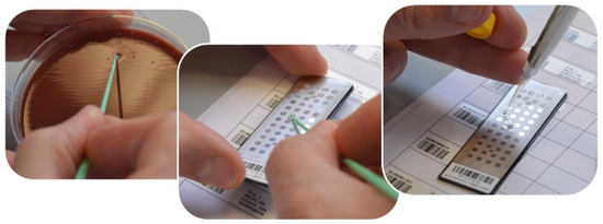 Ultrapure water was added to the tubes containing dentin samples and homogenized in a tube shaker for 30 s with 3300 rpm following two cycles of ultrasonic vibration at 42,000 Hz for 8 min and agitation at 3300 rpm for 30 s to detach the microbial cells. A decimal dilution up to 1:10 was applied after performing test dilutions for microbiological analysis protocol standardization. A physiological solution with a pH value of 7.4, containing 9 g of NaCl, and 1000 mL of distilled water was used as diluent. The sample dilution technique was performed by mixing, in a sterile test tube, 1 mL of the sample and 9 mL of the diluent. The culture conditions set up for the study included the incubation of the culture media in anaerobiosis (with anaerobic jars), with an atmosphere of 80% nitrogen, 10% hydrogen, and 10% carbon dioxide, and incubation in aerobic conditions enriched with carbon dioxide at three different temperatures (i.e., 30 °C, 37 °C, and 42 °C). The samples were plated in triplicate to evaluate the microorganisms viability in different types of culture media to identify the microbial load and the colony-forming units (CFUs): Chocolate Agar with hemoglobin and yeast concentrate, for all the microorganisms; Sabouraud Agar (BD, Becton, Dickinson and Company)with chloramphenicol for fungi, such as Candida spp.; Columbia CNA Agar (BD, Becton, Dickinson and Company) with antimicrobial agents, such as colistin and nalidixic acid, which made it selective for gram-positive bacteria, Streptococci and Staphylococci; MacConkey Agar (BD, Becton, Dickinson and Company) for gram-negative bacteria; Shaedler Agar (BD, Becton, Dickinson and Company) for strict anaerobes; and Haemophilus Agar (from Biomèrieux Italia S.p.A.), a selective medium with factors X and V and yeast extract. Then, a pure culture was prepared by sterilely taking the microorganisms from the isolated colonies and analyzed using a mass spectrometry with MALDI TOF technology (VITEK MS Biomèrieux system, Biomèrieux Italia S.p.A.), as shown in Figure 3.