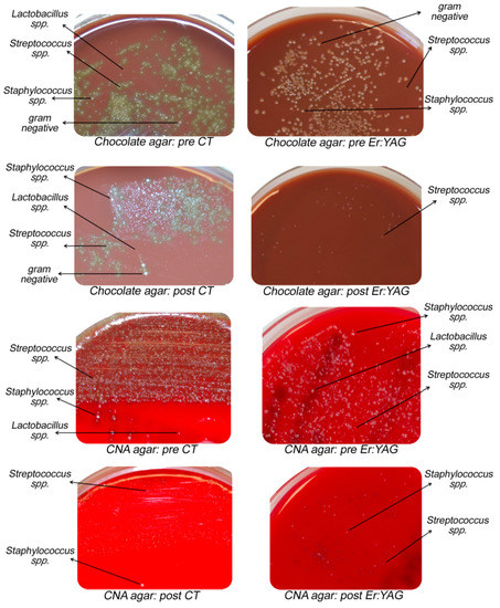 Difference in gram-positive and gram-negative colonies growth after Er:YAG treatments (right) vs. CT (left). Pre CT: pre-treatment with conventional therapy; post CT: post-treatment with conventional therapy; pre Er:YAG: pre-treatment with laser therapy; post Er:YAG: post-treatment with laser therapy.