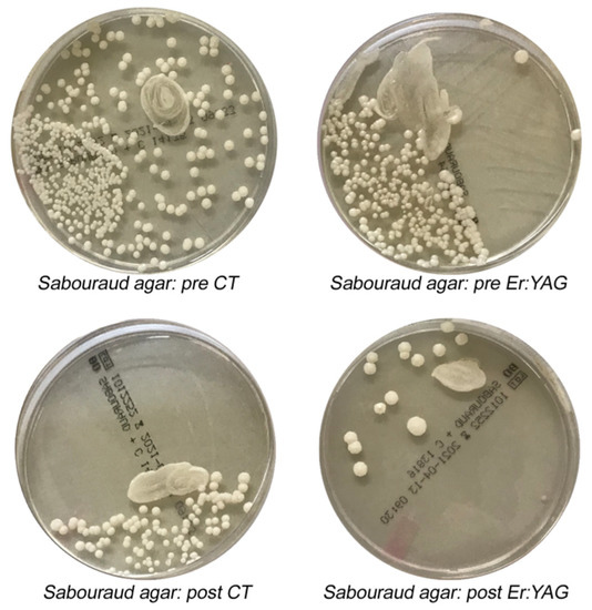 Difference in Candida albicans (C. albicans) colonies growth after Er:YAG treatments (right) vs. CT (left). Pre CT: pre-treatment with conventional therapy; post CT: post-treatment with conventional therapy; pre Er:YAG: pre-treatment with laser therapy; post Er:YAG: post-treatment with laser therapy.