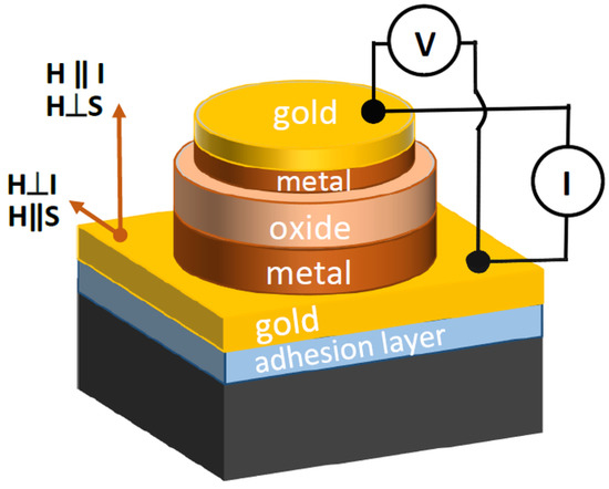 The studies of electrical transport properties were performed with standard four-probe technique and involved magnetoresistance () and current-voltage characteristic (I-V) measurements. A sketch of the junction is presented in Figure 1. The electrical contacts are assembled to the bottom and top gold layers and the measurement is done through the metal/metal oxide/metal junction. We used Keithley 2400 current source, Keithley 2182A nanovoltmeter, and channel switcher Keithley 3706A (Tektronix Company, Beaverton, OR, USA) during the measurements. The control of temperature and magnetic field was provided by the SQUID XL magnetometer. The and I-V studies were conducted in a field range of kOe at high (300 K) and low (5 K) temperatures in longitudinal and transverse geometries, i.e., H‖I (H⊥S) and H⊥I (H‖S), respectively.