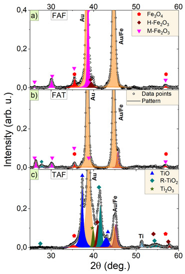 Diffraction patterns of FAF, FAT, and TAF junctions are presented in Figure 2. The peaks of constituent layers of Au, Ti, Fe, as well as iron and titanium oxides, are identified. The strongest signal originates from the gold layers. The peak at degrees from Au (111) crystallographic plane with maximal intensity is observed in all junctions, showing preferential growth in this crystallographic direction, i.e., the most densely packed direction of fcc structure. The most intense diffraction peaks from titanium and iron layers have similar positions as gold and they overlap substantially. The presence of bcc Fe phase [42] is noticeable at approximately 45 degrees. The intensity of common Au/Fe peak decreases in dependence on iron content in the junction. The Ti, which typically crystallizes in hcp structure, can be identified only in the diffractogram of TAF junction. However, it is known that, for thin films, a stable Ti fcc phase can be also found with a lattice constant of Å [43,44], very close to the lattice constant of Au Å [45]. Hence, the distinction between phases of Au and fcc Ti from XRD studies is not possible.