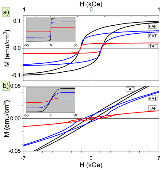Field dependent magnetization curves for FAF, FAT, and TAF junctions measured at room temperature for (a) H‖S and (b) H⊥S geometry. The insets show the curves in the range of a magnetic field of kOe.