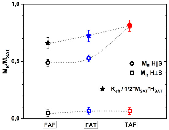 The values of magnetic remanence normalized to the saturation magnetization () for both geometries are presented in Figure 5. The remanence values for H⊥S direction are below , while, for H‖S, geometry are around for FAF and FAT and for TAF junctions. Such values show strong influence of shape anisotropy associated with in-plane easy magnetic direction. We calculated, based on the approach presented in Reference [48], the effective magnetic anisotropy constant () to confirm the role of shape anisotropy. In short, the effective magnetic anisotropy was calculated as a difference between the areas from first quadrants of easy and hard magnetic directions. To compare the values of magnetic anisotropy between the junctions, a ) ratio was calculated. and are the saturation magnetization and magnetic field for hard magnetic direction, and the is a maximum value of magnetic anisotropy constant [49]. Such ratio will be equal to 1 for a case of ideal magnetic anisotropy and 0 for isotropic distribution of magnetic moments. The obtained values are between 0.65–0.85 and confirm the presence of strong non-perfect in-plane magnetic anisotropy reflected also in opened curves for H⊥S direction and their slanted shape for H‖S direction. Surprisingly, the strongest magnetic anisotropy and remanence were found for TAF junction, with only one ferromagnetic layer and smaller content of iron than for FAF junction.