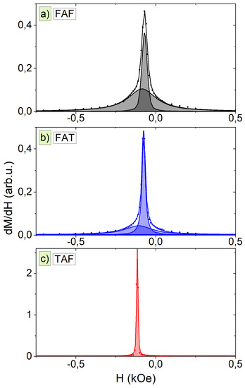 The hysteresis curves were also used to evaluate the switching field and its distribution. The switching field, defined as the field at which the inflexion on the curve occurs corresponding to the situation when a maximal number of magnetic moments changes orientation for opposite, has been calculated as a maximum of derivative. We have also quantified the of switching field distribution and percentage contributions of the magnetic components. The informs about the magnetic homogeneity of the sample: if the magnetic moments alter the direction simultaneously the is narrow, whereas if the switching is scattered for a wider range of magnetic fields, then the distribution of the switching field is large. Such broadening can be observed for grains or clusters of magnetic material with different sizes or for chemically disordered samples. The results of the distribution at 300 K for H‖S geometry are shown in Figure 6. The presence of two switching field components indicates the existence of two distinct magnetic contributions. These components have similar values of the mean switching field but differ in widths; one is narrow, and the other is broad. The exception is TAF junction for which we found only one component with a narrow distribution. The existence of two magnetic components in FAF and FAT junctions can be explained as follows: one component with narrow distribution comes from iron layers, while the other with broad distribution originates from chemically disordered AFeO layer consisting different phases of iron oxides as was previously demonstrated by XRD studies.