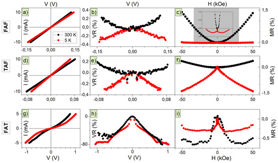 The current-voltage characteristics (I-V) and magnetoresistance dependencies of junctions were measured at 5 K and 300 K. Figure 7 presents results for longitudinal configuration since the measurement geometry does not affect the obtained results. The I-V characteristics presented in Figure 7 for FAF and TAF samples, i.e., junctions terminated with iron demonstrate the ohmic type of conductivity. The characteristics are symmetric as a function of polarization voltage and the rectifying ratio, i.e., the ratio of forward to reverse current at maximal voltage, is equal to 1 with accuracy better then . In contrary the FAT junction has a strongly nonlinear I-V characteristic (see Figure 7g). For the bipolar junction of semiconducting metal-oxide with a double Schottky diode the nonlinear, but symmetric with polarization voltage current-voltage dependence is usually observed, as found for FAT sample. The rectifying ratio in this case is slightly above at 300 K and reduces to at 5 K. The shape of the I-V curve for FAT junction is characteristic for varistor of a two-terminal bipolar diode, where [50,51] with being the nonlinearity coefficient. The stronger variation of from unity the stronger deviation from ohmic-type of conductivity. The obtained value of the nonlinearity coefficient [52] in case of FAT junction is around at 300 K and increases to at 5 K and does not show variation with magnetic field or measurements geometry. The switching voltage between passive and active state, i.e., a voltage for which a strong deviation from linear I-V dependence occurs, is around V. Similar values of nonlinearity coefficient and switching voltage were found for iron titanites, such as mixtures of hematite-ilmenite with semiconducting properties [51,53]. Therefore, it can be expected that the varistor-like properties in FAT sample might be a result of the intermixing and formation of Fe-Ti-O oxide barrier at the interface between AFeO and top Ti layer. The effect of atomic intermixing in our junctions was previously identified in XRD studies. The values of the nonlinearity factor are relatively small as compared with the most effective varistors based on ZnO or SnO ceramics where it can reach values of several dozen or above hundred [54,55]. However, in these materials, the switching voltage is very large, and the active state is obtained for gating with several or more volts, an order of magnitude more then in case of FAT junction.