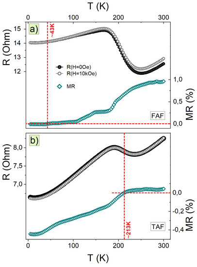 Additionally, we measured the curves of FAF and TAF junctions to better understand processes related to sign changes of magnetoresistance. Figure 8 shows temperature dependent resistivity collected without and with magnetic field of 10 kOe and determined values of . The temperatures at which changes sign are marked with red lines in Figure 8. The change of sign was found at K for FAF and at K for TAF samples.