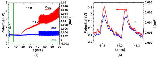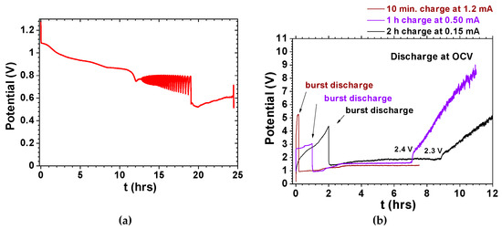 Conductor1/ferroelectric-electrolyte/conductor2 cells showing self-charging and self-cycling while the cell is set to discharge. (a) Zn/ferroelectric-electrolyte (Na2.99Ba0.005ClO)/C + Cu cell showing bifurcations corresponding to self-cycling while discharging with a resistor of 1000 Ω at 60 °C as in Figure 1e (adapted from [70]); (b) Cu/ferroelectric-electrolyte (Na2.99Ba0.005ClO)/Cu cell after quick charge followed by discharge at open-circuit voltage to 1.1–1.3 V, for then self-charging to 2.3–2.4 V after 6 or 8 h up to approximately 9 or 5 V, respectively (adapted from [65]).