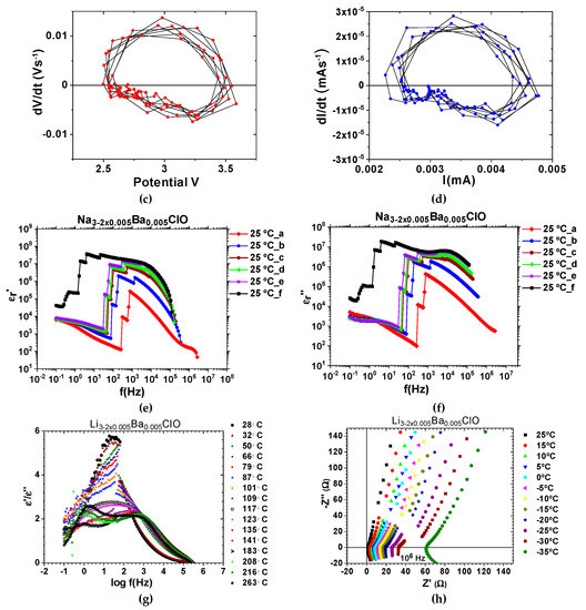 Conductor1/ferroelectric-electrolyte/conductor2 cells showing self-charging and self-cycling while set to discharge and amplitude jumps (discontinuities) related frequency response in a Duffing oscillator as shown in Figure 1g; (a) self-charge and self-oscillations observed with an Al/90 wt. % Li-glass (Li2.99Ba0.005ClO) + 10 wt. % Li2S/Cu cell while set to discharge at a constant current of −1 µA (adapted from [70]); (b) inset of (a) showing small oscillations like n in Figure 2f and w (current) in Figure 2g; (c,d) phase portraits of the voltage and current oscillations shown in (a,b) which clearly show limit cycles; (e,f) relative real and imaginary permittivities for Na2.99Ba0.005ClO for different times at 25 °C showing jumps in the amplitude of the forced oscillations imposed by the electrical impedance spectroscopy (EIS) measurement (adapted from [66]); (g) relative real and imaginary permittivities ratio for Li2.99Ba0.005ClO, at different temperatures, showing jumps in the amplitude of the forced oscillations imposed by the electrical impedance spectroscopy (EIS) measurement driving forces; (h) imaginary vs real impedances for Li2.99Ba0.005ClO, at different temperatures, showing jumps in the amplitude of the forced oscillations imposed by the electrical impedance spectroscopy (EIS) (adapted from [64]). Note: EIS is an AC technique, therefore, a frequency response as shown in Figure 1g for a Duffing oscillator is expected. The voltage amplitude was 10 mV.