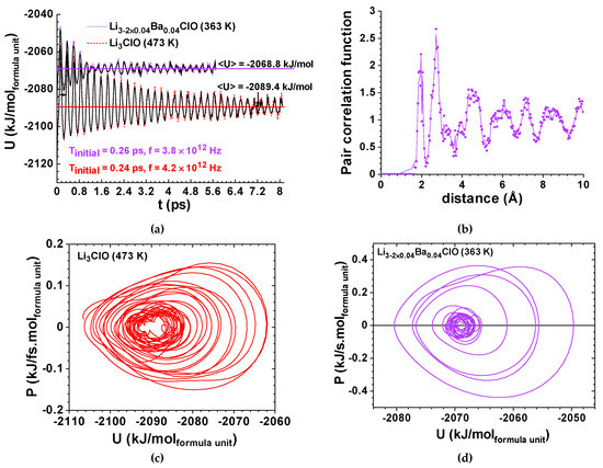 Ab Initio Molecular Dynamics for Li-glass ferroelectric-electrolytes; (a) potential energy vs time for Li2.92Ba0.04ClO and Li3ClO. The upper envelope energy for Li2.92Ba0.04ClO at 363 K before decoherence: kJ/molformula unit corresponding to a damping oscillator; decoherence is observed above 1.2 ps; the calculated specific heat is Cv’ = 0.193 kJ/kg K; the upper envelope energy for Li3ClO at 473 K before decoherence: kJ/molformula unit corresponding to a damping oscillator; decoherence is observed above 7 ps; the calculated specific heat is Cv’ = 0.465 kJ/kg K; (b) pair correlation function for Li2.92Ba0.04ClO, at 363 K, showing first and second neighbors at fixed distances corresponding to sharp peaks and broad peaks for third and above neighbors’ distances indicating structural disorder, often associated with an amorphous character, as expected from experimental results; (c) phase portrait for power vs. energy for Li3ClO at 473 K corresponding to a damped coherent oscillator that becomes decoherent; the relaxation of the focus (equilibrium energy) corresponds to a variation of 0.3% from the initial focus energy; ΔUmax = Umax − Umin 0.46 eV; (d) phase portrait for power vs energy for Li2.92Ba0.04ClO, at 363 K, corresponding to a damped coherent oscillator that becomes decoherent; the relaxation of the focus corresponds to a variation of 0.2% of the initial energy; ΔUmax 0.32 eV. Note: both (b) and (c) are similar to the Duffing oscillator model in Figure 1f.