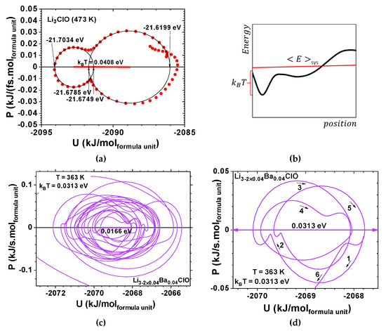 Ab Initio Molecular Dynamics for Li-glass ferroelectric-electrolytes showing decoherence; (a) inset of the phase portrait of Li3ClO showing a double-well potential; (b) schematic representation of energy vs position, showing that thermal excitation allows a molecule to hop back and forth between the wells; (c,d) insets of the phase portrait of Li2.92Ba0.04ClO showing back and forth paths between the wells described by a van der Pol-Duffing oscillator model as the one in Figure 1f and Figure 2d. Note: Potential energy is and power is where is an applied force, atom displacement, and atom velocity.
