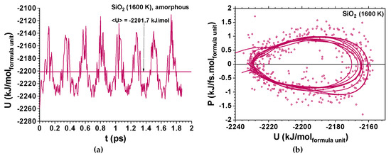 Ab Initio Molecular Dynamics for the amorphous Si3O6 showing noise and a quasi-periodic structure; (a) total energy vs time for SiO2 at 1600 K; the calculated specific heat is Cv’ = 0.826 kJ/kg K; no damping is observed; (b) phase portrait of SiO2 for power vs potential energy showing one energy well and almost no anharmonicity. The difference between the two energy states is ΔU 0.62 eV and kBT = 0.129 eV. Almost no focus (equilibrium energy) displacement is observed. Note that simulations not shown here demonstrate that for a larger box such as that containing Si108O216, decoherence is achieved immediately even at room temperature.