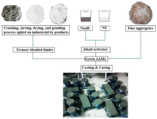 Figure 1 depicts the production stage of alkali-activated green mortar, using ternary blended industrial byproducts. Ternary blended AAMs were examined to determine the influence of calcium oxide on the geopolymerization process. Using trial mixtures, the optimal ratio of sodium silicate-to-sodium hydroxide alkali activators, sodium hydroxide molarity, binder-to-aggregate ratio, and alkaline solution-to-binder ratio were determined as 0.75, 4M, 1, and 0.4, respectively, hence these values were fixed for all AAMs. Analytical grade sodium silicate solution “Na2SiO3” (NS), comprised of SiO2 (29.5 wt %), Na2O (14.70 wt %), and H2O (55.80 wt %), in combination with sodium hydroxide (NaOH) were used as the alkali activator to prepare the proposed AAM mixtures. NaOH pellets were dissolved in water to make the alkaline solution with 4M concentration. In the first phase, the solution was cooled for 24 h and then added to the sodium silicate (NS) solution to obtain an alkaline activator solution with a modulus ratio (SiO2 to Na2O) of 1.02. The ratio of NS to NaOH was fixed to 0.75 for all the alkaline mixtures.