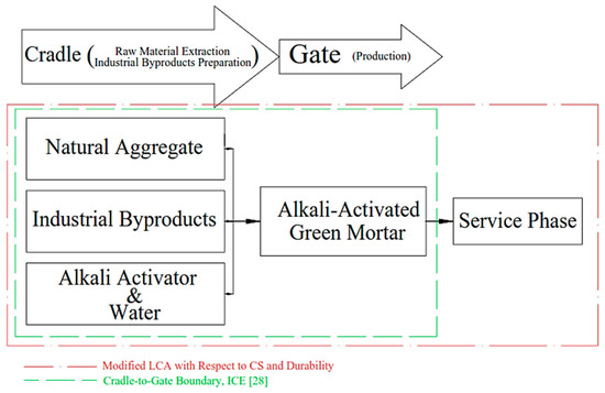 The LCA technique considers different scenarios and possibilities to minimize raw material and energy consumption and decrease the environmental footprint of construction materials. The processes and assumptions considered in these scenarios should be based on current technological developments and standard practices. This approach may be conservative, particularly for recycling and reuse of materials, for which major improvements are expected, considering that the market for secondary materials is still at an early stage of development [31,32]. The first scenario for LCA in this research is cradle-to-gate, which is characterized by the major processes associated with raw materials extraction and materials production stages, in compliance with ICE [30,33,34,35]. Figure 2 depicts the cradle-to-gate of ternary blended AAMs. Such a conventional scenario was already applied to “green” concrete containing industrial byproducts, AMMs and geopolymers made with FA, GBFS, MK, along with alkali activators such as sodium hydroxide [36,37,38]. Nevertheless, such a traditional scenario is not sufficiently reliable for assessing the environmental impacts (or benefits) of green concrete products since it precludes the advantageous effects of alkali-activated binders composed of industrial byproducts on the mechanical properties and durability. Only a dearth of research considered the normalization of the climate change potential with respect to green concrete’s mechanical properties [39]. Since the life span of concrete and mortar can be extended via improving the durability and mechanical properties, these parameters should be captured in the domain of the LCA criteria. Thus, in the present research, by defining another scenario, the cradle-to-gate LCA is adapted by taking the mechanical properties and durability of the AAMs into consideration. Using this approach, not only the impact of material manufacturing is accounted for, but also the impacts of service life are incorporated in the LCA criteria.