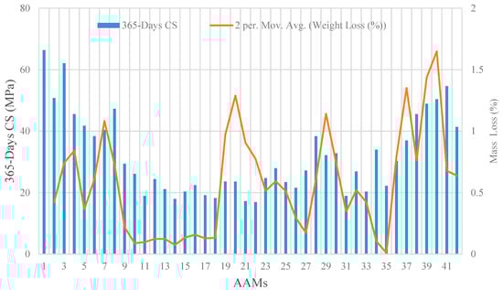 Figure 3 illustrates the residual CS and mass loss of all the 42 AAM mixtures after 365-days of immersion in the sulfuric acid solution. On average, the CS and specimen mass declined by 90 and 0.56 percent, respectively, compared to the control intact specimens. The maximum reduction in CS was inflicted to specimens in the category of high-volume GBFS by around 300%, while the specimens with high-volume WCP experienced major mass loss of an average 0.85%. Figure 4 illustrates the residual CS and mass loss of all 42 AAMs after 365-days of immersion in the sulphate solution. There was generally a similar pattern observed for residual CS compared to that of immersion in the sulfuric acid solution, whereas the maximum mass loss was recorded for specimens with high-volume GBFS by an average of 0.66%.