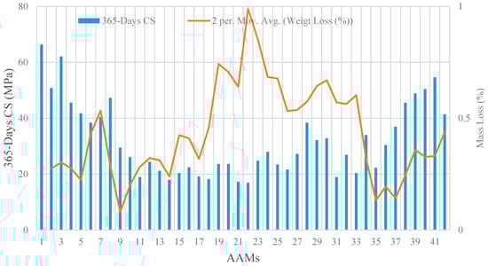 Effects of exposure to sulfuric acid solution on CS and mass loss of AAM mortars.