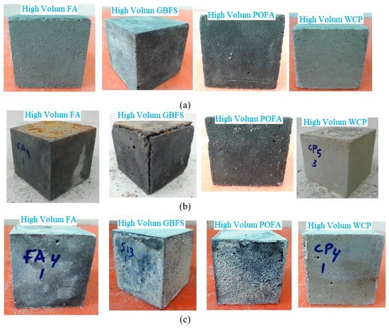 Physical appearance of cubic AAM mortar specimens made with different industrial byproducts: (a) control sample, (b) after 365-days of immersion in sulfuric acid solution, and (c) after 365-days of immersion in sulphate solution.