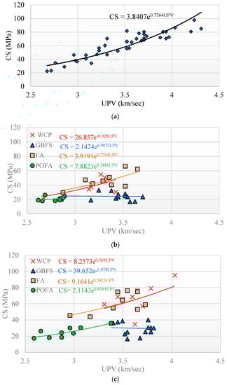 Relationship between ultrasonic pulse velocity (UPV) and CS for all 42 AAM mixtures: (a) original condition, (b) after immersion in sulfuric acid solution, and (c) after immersion in sulphate solution.