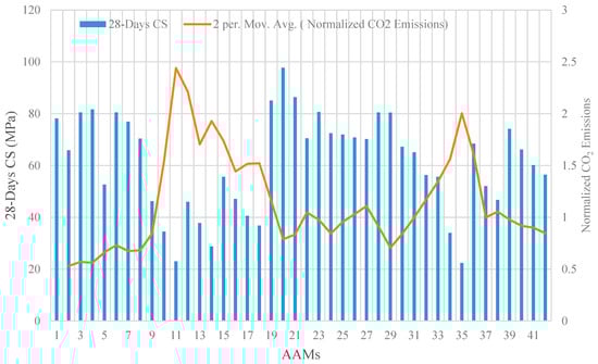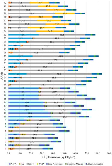 For a consistent and systematic comparison among AAM mixtures, their CO2 emissions are normalized with respect to CS, as shown in Figure 9. The results confirm that in AAM mixtures incorporating high-volume FA and GBFS, a lower intensity of normalized CO2 emissions is achieved. The highest intensity of normalized CO2 emissions was recorded for AAM mixtures containing high-volume POFA, which is correlated to its relatively low CS and high CO2 emission. For a given CS, a lower intensity of normalized CO2 emissions can be achieved by replacing FA with GBFS. For instance, at CS of around 80 MPa, a reduction in GBFS from 70% (Mixture 9) to 30% (Mixture 1) reduced the normalized CO2 emission from 1.15 CO2·m−3/MPa to 0.5 CO2·m−3/MPa. By substituting 20% of WCP mass (Mixture 35) with FA (Mixture 41) in AAMs containing high-volume WCP, the intensity of normalized CO2 emissions could be decreased by around two times.