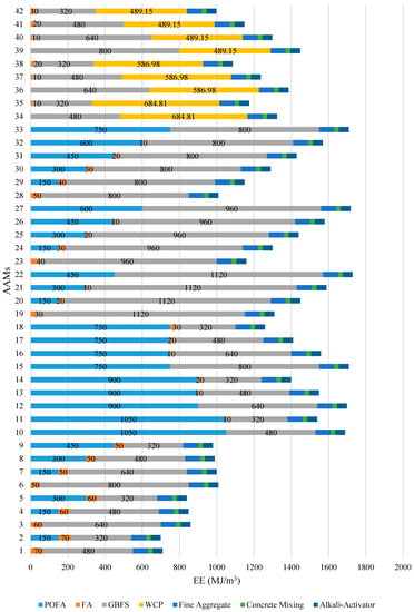 The estimated CO2 emissions and EE per cubic meter of AAM for all the 42 mixtures explored are illustrated in Figure 7 and Figure 8, respectively. The percentage distribution of CO2 emissions and EE associated with the production of non-cementitious materials, fine aggregate, mixing, and alkali activator, were considered constant for all the AAM mixtures. The results indicate that the AAM mixture with high-volume FA emitted the least amount of CO2 and consumed the least amount of energy with an average of 45.5 kg CO2/m3 and 881.2 MJ/m3, respectively. On the other hand, the AAM mixture made with high-volume GBFS emitted the highest CO2 amount, while the AAM mixture made with high-volume POFA consumed the highest amount of energy with an average of 70.6 kg CO2/m3 and 1534.5 MJ/m3, respectively. The results confirm that the CO2 emissions and energy consumption associated with the production of AAM made with GBFS and POFA are relatively higher compared to that of AAM made with other industrial waste materials. Such results can be explained by the higher amount of electricity required for grinding GBFS to obtain the recommended particle size and for drying POFA in the oven at a temperature of 110 ± 5 °C for 24 h. Overall, it can be concluded that the highest CO2 emissions and EE of all 42 AAM mixtures studied were significantly lower than that of the benchmark conventional mortar prepared using OPC (1/3 cement-sand mix), which is associated with 436.8 kg CO2/m3 and 2793 MJ/m3, respectively.