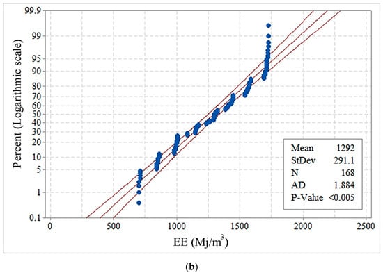 The ANN used in this study was the Newff Feed Forward; 70% of the experimental data (118 data units), out of 168 experimental data, was used for training, and the remainder 30% (50 data units) was used for network testing. To optimize the ANN’s weights and biases, the COA was used to provide the least prediction error for the trained structure (modified with PCA). The properties of the COA parameters are shown in Table 7. Also, considering that the statistical behavior of the output data (EE and CO2) should be evaluated, probability plot diagrams related to determining their normal distribution were examined. The results showed that their statistical behavior followed a normal distribution, as illustrated in Figure 14.
