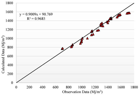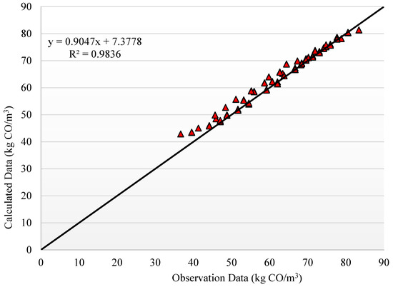 The results of the trained and optimized PCA-COA-ANN model are depicted in Figure 15 and Figure 16 for the EE and CO2 emissions output parameters, respectively. The results indicate that the PCA-COA-ANN estimated reliable and accurate values for the ratio of observational to computational values, R2, for both input parameters, indicating high accuracy and robustness of the proposed model. Table 8 provides the final weights and biases for both hidden layers estimated by the PCA-COA-ANN model. Using the values of these weights and biases between the different ANN layers, the two output parameters (EE and CO2 emissions) can be determined and predicted. Moreover, these final weight and bias values can be used to design AAMs with targeted mechanical properties and CO2 emissions with respect to the availability of industrial byproducts and environmental constraints. Accordingly, rather than executing extensive and laborious experimental programs to reach reasonable results, the trained model could be run in a very short time to obtain near optimal results. Only limited experimental validation could be carried out thereafter to ensure that variability in local materials and experimental equipment and procedures do not alter the model predictions significantly. Moreover, the experimental validation data could be cumulated and used further in model training and fine tuning for local conditions, which could save time and cost in AAM mixture design development.