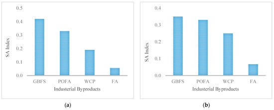 Using X-ray fluorescence spectroscopy (XRF, HORIBA, Singapore, Singapore), the chemical compositions of the industrial byproduct materials were determined, as given in Table 1. It was revealed that the main compound in POFA, FA, and WCP, was SiO2 (64.2%, 57.2%, and 72.6%, respectively), whereas in GBFS, CaO was the main compound (51.8%). Al2O3, SiO2, and CaO are essential oxides throughout the hydration and production processes of the C-(A)-S-H gels. Nevertheless, the low contents of Al2O3 and CaO in WCP require adding materials comprising high quantities of Al2O3, such as FA, and CaO rich materials, such as GBFS, to produce high-performance alkali-activated binders. According to ASTM C618-15 [26], FA and WCP are classified as class F pozzolans due to the existence (higher than 70%) of SiO2 + Al2O3 + Fe2O3.