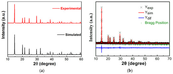 Powder XRD patterns of [(CH3)2NH2][Fe(HCOO)3] at room temperature, (a) the experimental and simulated XRD patterns, (b) Rietveld fit of XRD pattern. The simulated XRD pattern was for rhombohedral Rc structure (CCDC 780885) [17].