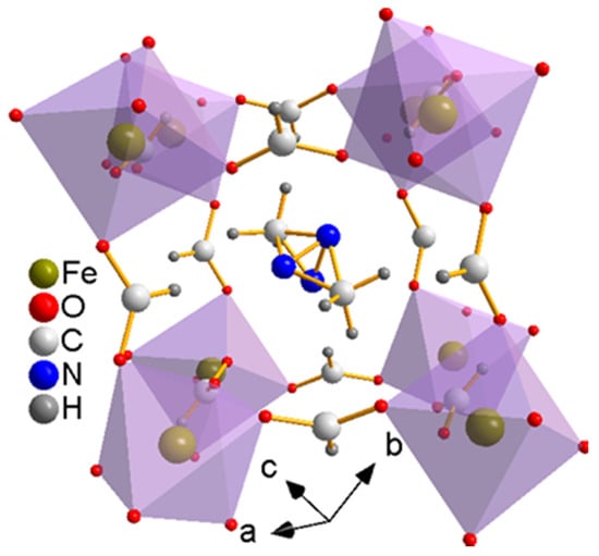 They are in good agreement with the results reported by Jain et al. (α = β = 90°, γ = 120°, a = b = 8.241(2) Å, c = 22.545(6) Å [17]), the results reported by Zhou et al. (α = β = 90°, γ = 120°, a = b = 8.249 Å, c = 22.556 Å with Rwp = 4.849%, Rp = 3.462% and χ2 = 8.733 [33]), and the results reported by Ma et al. (α = β = 90°, γ = 120°, a = b = 8.2312(12) Å, c = 22.506(5) Å [34]). It was reported that the crystals usually grow along the [012] direction according to single crystal XRD analysis [28,29,30,31]. As shown in Figure 2, the structure of [(CH3)2NH2][Fe(HCOO)3] is ABX3 perovskite-like, in which A is [(CH3)2NH2]+, B is Fe2+, and X is HCOO−. The skeleton is formed by Fe2+ linked with HCOO−, and [(CH3)2NH2]+ is located in the central cavity. Hydrogen bonds are formed between the hydrogen atoms of [(CH3)2NH2]+ and the oxygen atoms of HCOO−.