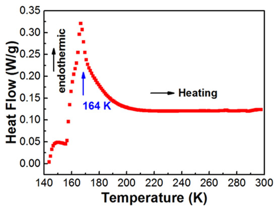 As shown in Figure 3, DSC curve of [(CH3)2NH2][Fe(HCOO)3] from 140 K to 300 K indicated an endothermic peak at 164 K. The average enthalpy ∆H was 1202 J mol−1, and the average entropy ΔS was 7.2 J mol−1 K−1. The ratio of the configuration numbers in the disordered and ordered systems, N, was 2.35. N would be 3 for a simple 3-fold order-disorder model. Therefore, the transition in [(CH3)2NH2][Fe(HCOO)3] near 164 K was more complicated than a simple 3-fold order-disorder model for [(CH3)2NH2]+. For [(CH3)2NH2][Fe(HCOO)3], the temperature dependences of dielectric and pyroelectric properties showed a sudden jump near 164 K with a hysteresis in the transition temperature during heating and cooling processes [17,28,34], indicating a first order ferroelectric transition from paraelectric to antiferroelectric caused by the disorder-order transition of the hydrogen bonding. The polar hydrogen bonds were antiparallel in the antiferroelectric state [34]. Maczka et al. reported anomalies in the temperature dependences of Infra-Red and Raman spectra near 160 K [32], due to the first-order structural transition from rhombohedral Rc at high temperature to monoclinic Cc at low temperature, accompanied by the disorder-order transition of proton ordering in the N–H⋯O hydrogen bonds in [(CH3)2NH2]+ as well as the distortion of the metal-formate framework. Below the transition temperature, the ordered phase showed proton ordering in the N–H⋯O hydrogen bonds in [(CH3)2NH2]+ [32].