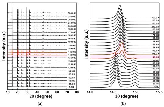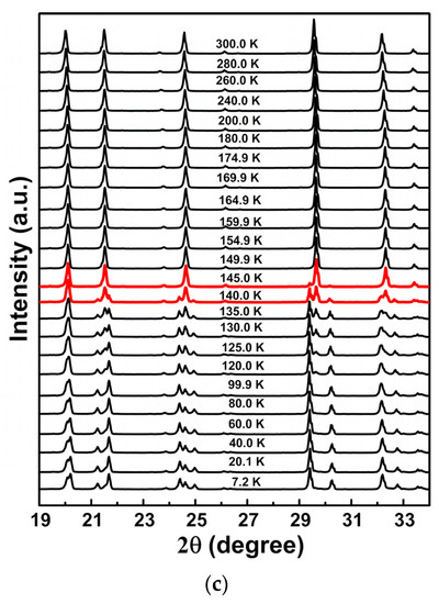 A Smartlab powder XRD system (Rigaku, Tokyo, Japan) was used to collect the powder XRD patterns from 300 K to 10 K. 2θ was between 10° and 70°, and the step size was 0.02°. The temperature step of 20 K was set between 300 K and 180 K, step of 5 K between 180 K and 120 K, step of 20 K between 120 K and 20 K, and step of 10 K between 20 K and 10 K. The temperature accuracy was 0.1 K using a Lakeshore temperature sensor. Low temperature XRD patterns were refined using GSAS.