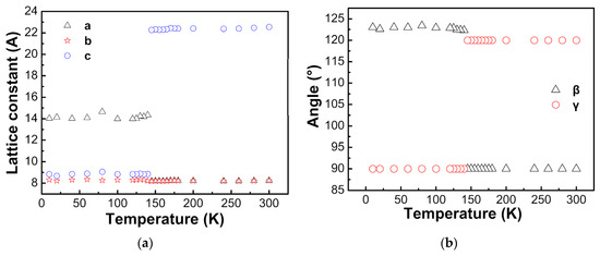 The differences in the transition temperatures determined by DSC and low temperature XRD may be due to the different heating rates employed. The temperature dependences of lattice parameters obtained by Rietveld refinement of low temperature XRD patterns are shown in Figure 5.