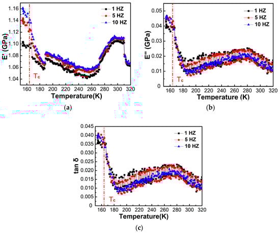 The anomalies near 280 K and 310 K in Figure 6 and the anomalies around 220–270 K in Figure 7 have no physical meaning, and they may be caused by the instability of the DMA measurements after the samples were under low frequency and high stress and strain conditions for some time.