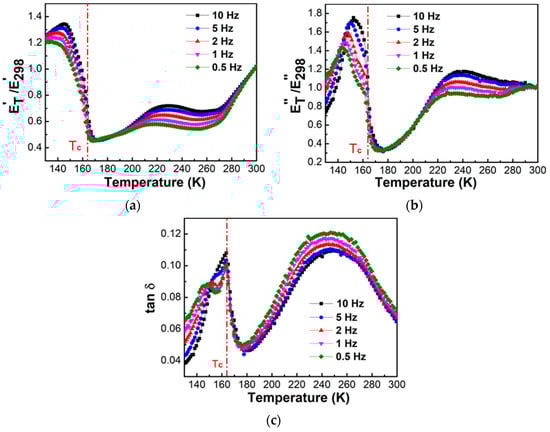 Temperature dependences of (a) the normalized storage modulus, E′T/E′298, (b) the normalized loss modulus, E″T/E″298, and (c) loss factor tan δ of [(CH3)2NH2][Fe(HCOO)3] pellets at frequencies of 0.5–10 Hz determined by DMA during heating at the rate of 2 K/min. The vertical dash-dotted line indicates the ferroelectric transition temperature Tc ~ 164 K.