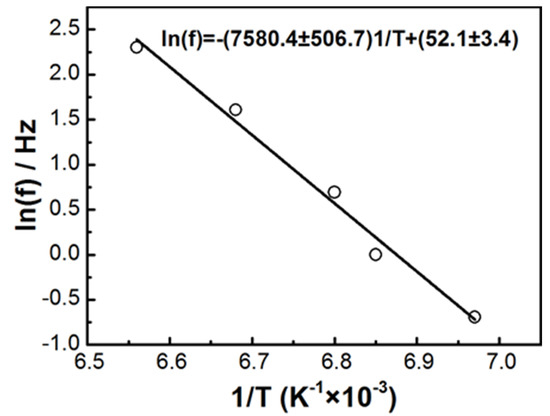 Figure 8 shows the fitting of ln(f) vs. 1/T for the peaks of the temperature dependences of the normalized loss modulus near 145 K as shown in Figure 7b, using Arrhenius equation f = f0exp[−Ea/(RT)], where R is the gas constant, T is the peak temperature for the normalized loss modulus near 145 K, and f is the frequency. The activation energy Ea was ~63 kJ/mol.