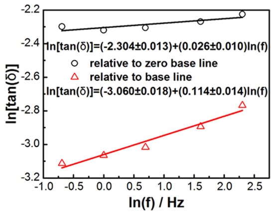Figure 9 shows the fitting of the double logarithmic plot ln(tan δ) vs. ln(f) for the peak height of tan δ near 164 K as shown in Figure 7c, using power law tan δ = Afn, where A is the constance, and f is the frequency.
