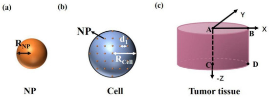 Simplified physical model of (a) a nanoparticle, (b) a cell, and (c) tumor tissue.