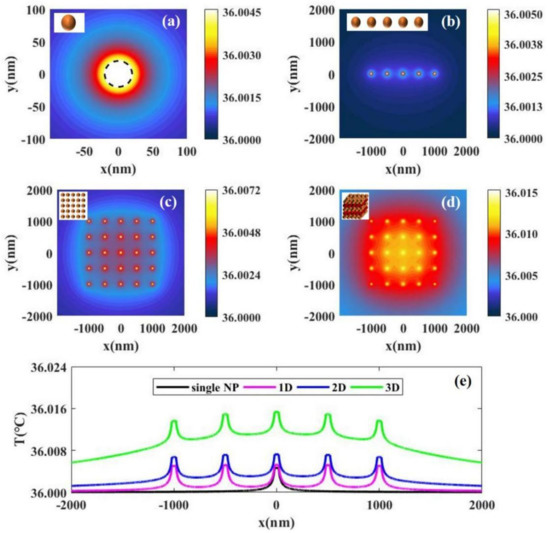 The temperature distributions with laser intensity I = 15 W/cm2 caused by the photothermal conversion of (a) a single nanoparticle, (b) 5 nanoparticles uniformly distributed along the x axis, (c) 5 × 5 nanoparticles uniformly distributed in the x–y 2D plane, and (d) 5 × 5 × 5 nanoparticles uniformly distributed the in x-y-z 3D space. (e) A comparison of the temperature distributions caused by the photothermal conversion of single and multiple particles. The distance between the nearest particles is 500 nm.
