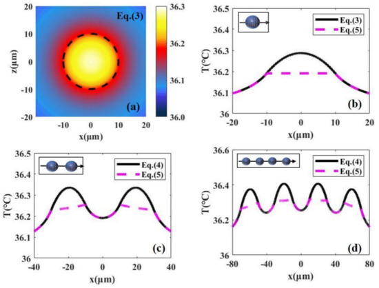 If nanoparticles enter the cell, we can calculate the temperature distributions of individual or more cells and their surrounding environment by Equations (3) and (4). We consider that the nanoparticles in the cell are uniformly distributed, as shown in Figure 1b. Figure 3a shows the temperature distribution of a single cell by using Equation (3). We find that the temperature of the cell center is the highest, and the temperature around the center gradually decreases, as shown by the black solid line in Figure 3b. Figure 3c,d gives the temperature distributions of two and four cells with their surroundings. We find that the more the cells, the higher the temperature increase, because multiple nanoparticles in cells work together, as shown by the solid lines in Figure 3c,d. In the calculations, we strictly consider the influence of each particle in the system on the temperature distribution using Equation (4). To simplify the calculations, we can consider the cell as a whole and calculate the temperature distributions using Equation (5). The results calculated by Equation (5) are shown by the red dotted lines in Figure 3b–d. We find that the temperature distributions outside cells obtained by Equations (4) and (5) are almost consistent, but the temperature distribution inside cells obtained by Equation (5) is obviously lower than that of Equation (4). When we analyze the temperature distributions of the tumor and the surrounding environment, we focus on the temperature outside the cells. In addition, there are a large number of cells inside the tumor, so the amount of computation is very large if calculated by Equation (4).
