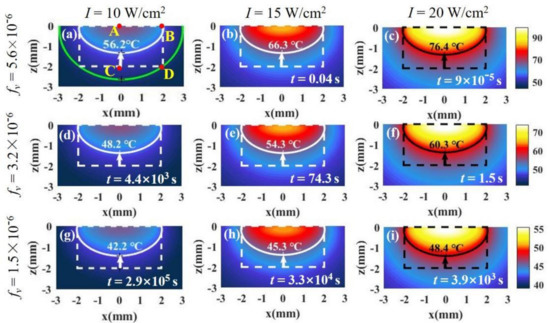 The reason that the isotherm through point B is above point C is mainly the attenuation of light intensity with depth. We can reduce the volume fraction of particles to weaken the attenuation of light intensity. From Figure 4a,d,g, the lowest point of the isotherm moves down as the volume fraction decreases. We can see that the smaller the volume fraction, the more uniform the temperature distribution, but the temperature decreases at the same time. The results are in agreement with the results calculated by Ren et al. [11]. However, lower temperature means an increase in the treatment time required for irreversible tissue damage. The therapy time can be calculated by the Arrhenius equation [24]. In the figures, the time, t, is the minimum time required for irreversible tissue damage. In Figure 4d,g, the treatment times become very long (about 103–105 s) due to the decrease in the nanoparticle volume fraction. We can increase the temperature by increasing the light intensity. By comparing Figure 4a–c, we find that the temperature increases with an increase in light intensity, but the effect of light intensity on the temperature distribution is not obvious. In other words, the position of the isotherm hardly changes with the increase in light intensity. We find that the temperature distribution can be controlled by adjusting the volume fraction, but the temperature distribution is still not ideal. The temperatures at points C and D are still less than that at point B even if the volume fraction is very low.